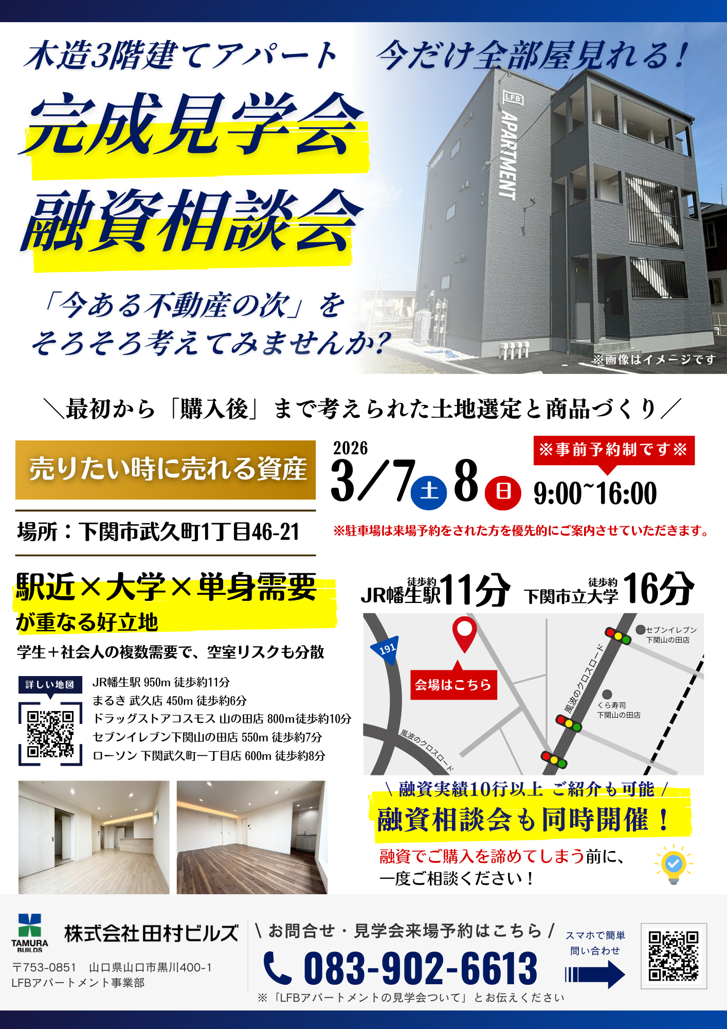 このたび下関市武久町にて、木造3階建てアパートの完成見学会・融資相談会を開催します。